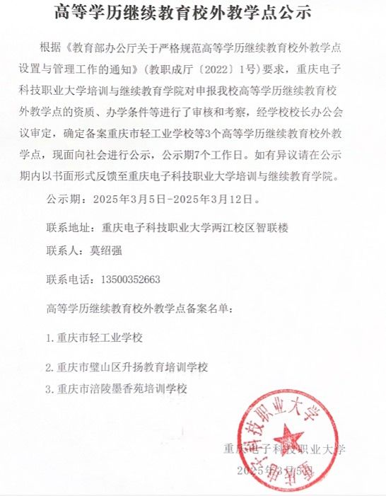 返回列表 重庆电子科技职业大学高等学历继续教育校外教学点公示 日期:2025-03-05发布人:何柳英浏览量: 返回列表 上一篇 重庆电子科技职业大学成功举办成人高等学历继续教育2025级开学典礼暨入学教育 下一篇 我校召开自考职业本科(专升本)开考论证工作交流会
