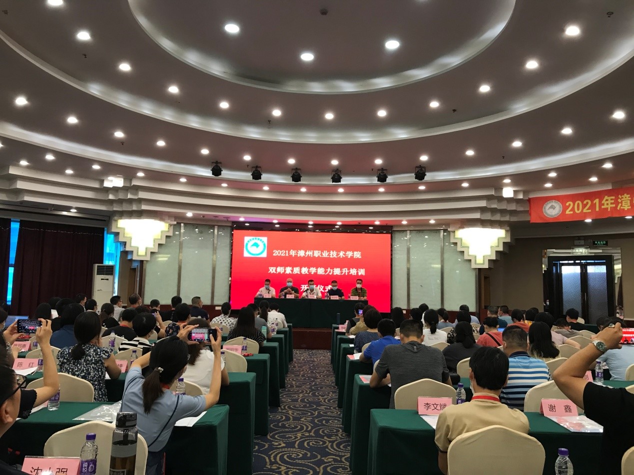 7月29日上午,由我校组织实施的2021年漳州职业技术学院双师素质教学能力提升培训顺利开班。漳州职业技术学院经济管理学院院长、文化创意学院院长沈文馥,经济管理学院党总支书记姚俊,文化创意学院党总支书记蔡志恩,我校应用技术学院院长、培训与继续教育中心主任陈志军,培训与继续教育中心培训科负责人王科,以及来自漳州职业技术学院89名学员参加了开班仪式。
