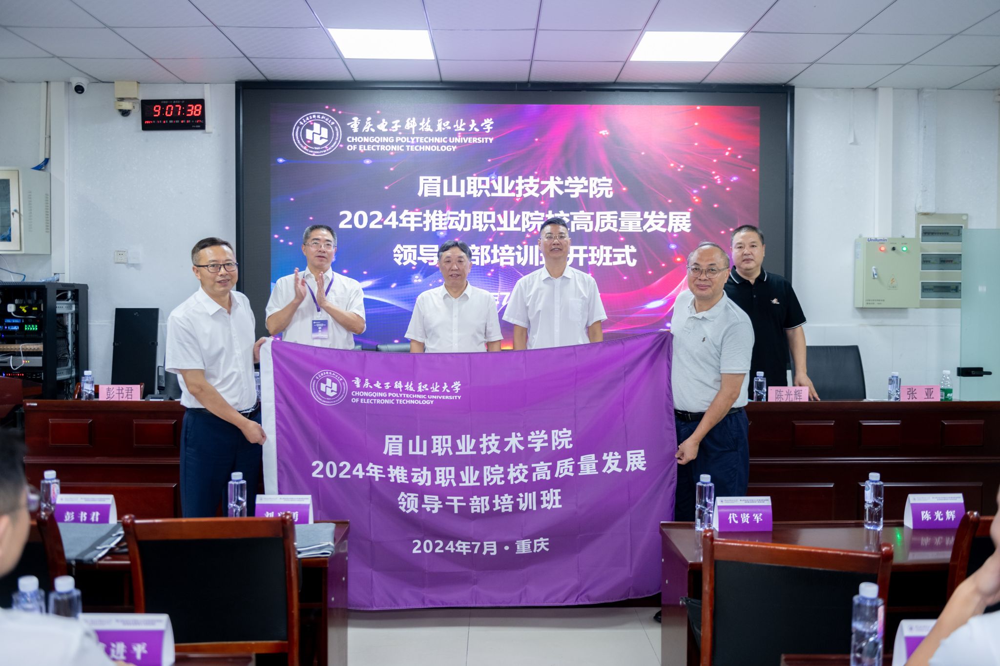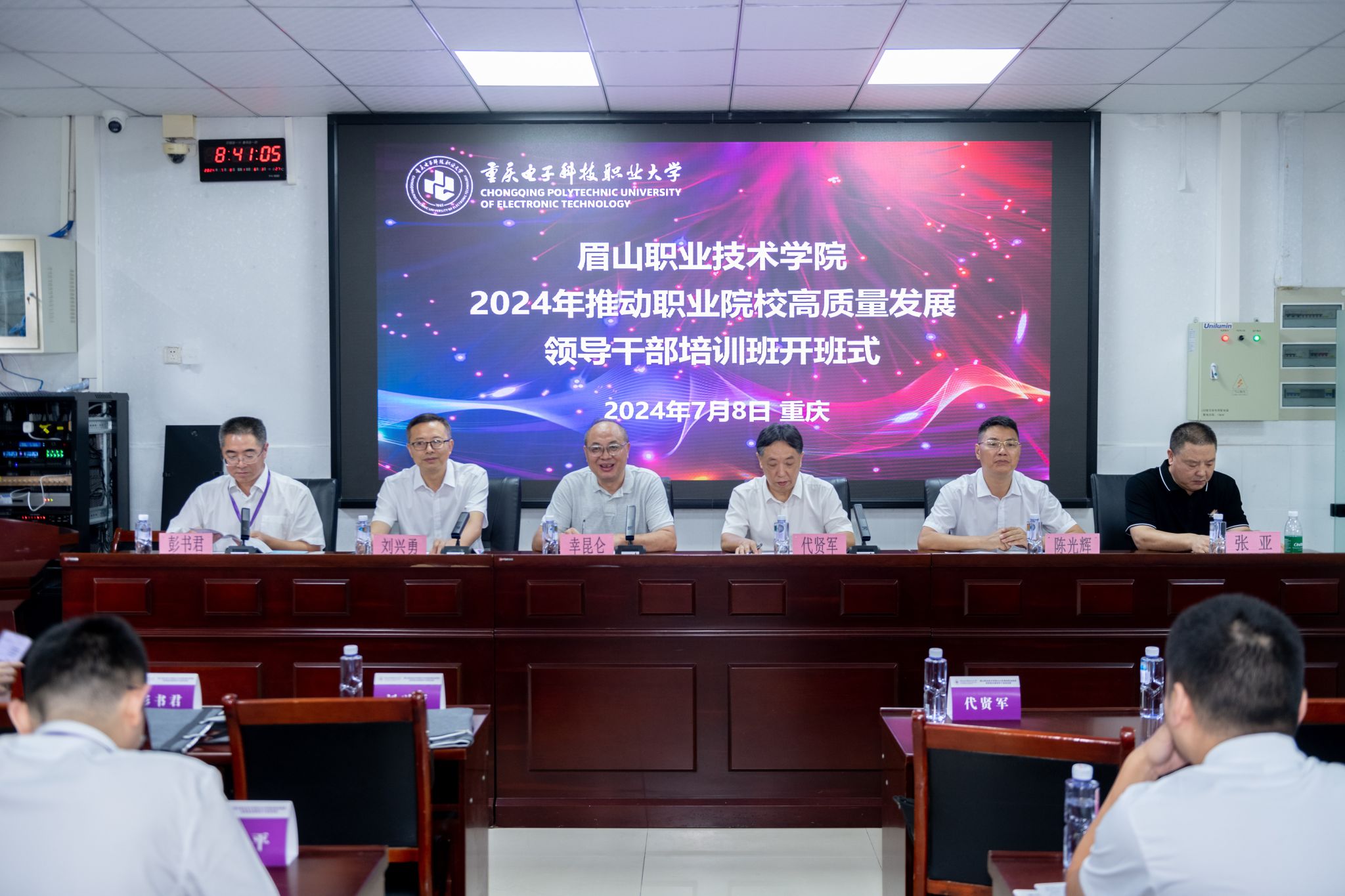7月8日,眉山职业技术学院 2024年推动职业院校高质量发展领导干部培训班在重庆电子科技职业大学职教师资培训基地博才厅举行了开班仪式。参加开班仪式的有重庆电子科技职业大学党委常委、副校长幸昆仑,国培基地办公室副主任张亚,眉山职业技术学院党委书记代贤军,党委副书记、院长刘兴勇,党委委员、副院长陈光辉,党委委员、工会主席彭书君以及来自眉山职业技术学院的42名干部学员。开班仪式由彭书君主持。
