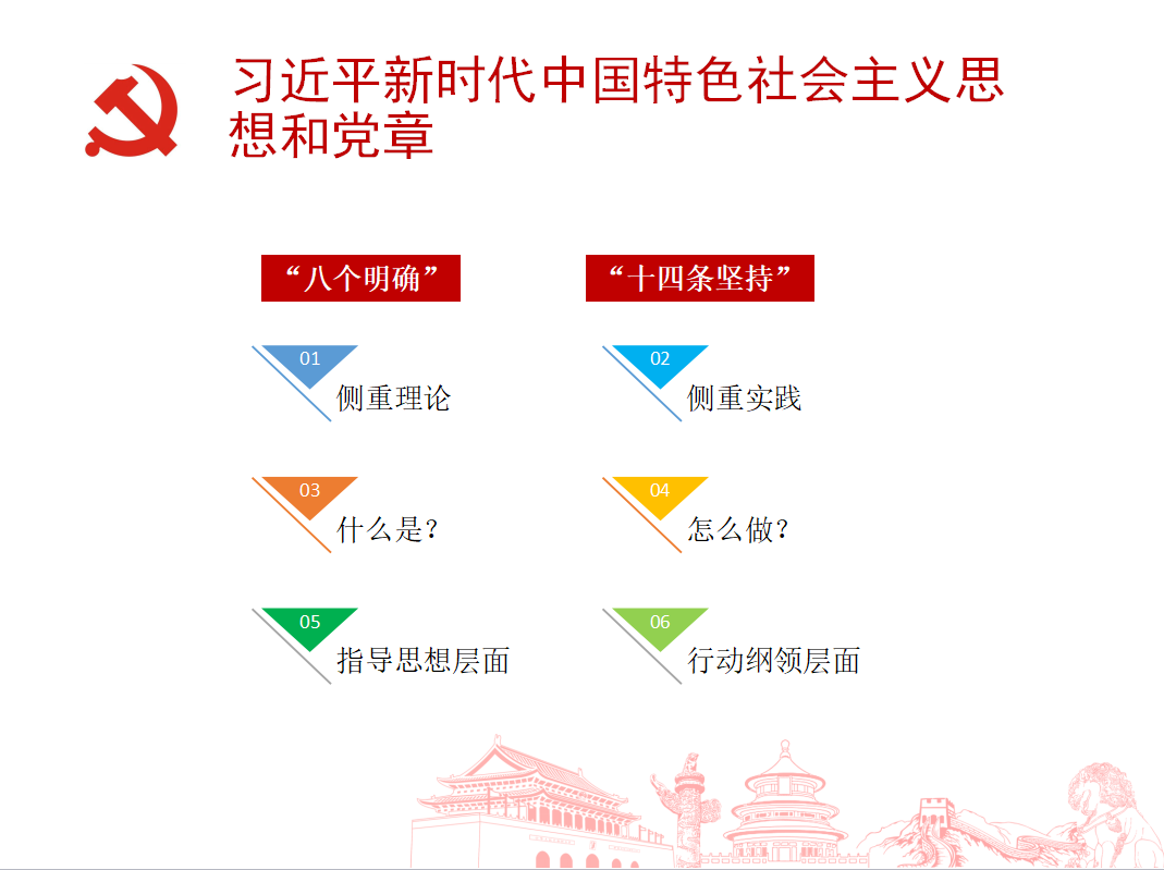 第三,由吴焱岷组织深入学习习近平新时代中国特色社会主义思想和党章的部分内容,这次主要学习的是“八个明确”和“十四个坚持”。