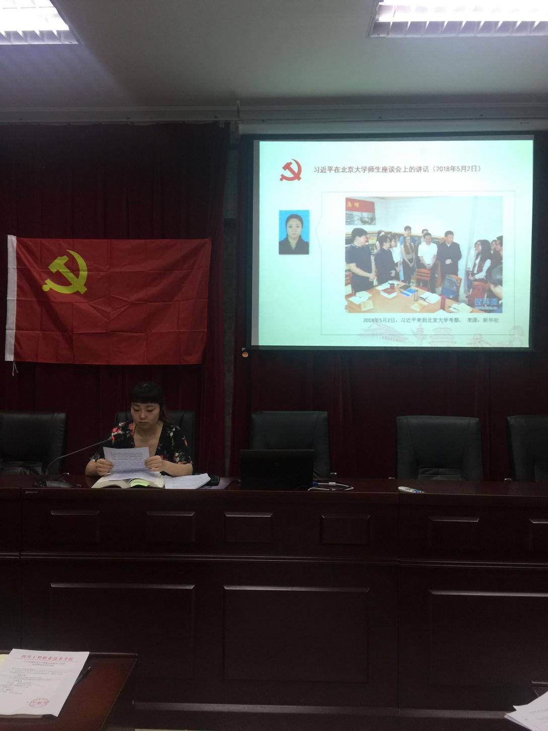 然后,周芸带领大家学习了习近平在北京大学师生座谈会上的讲话精神(2018年5月2日)。