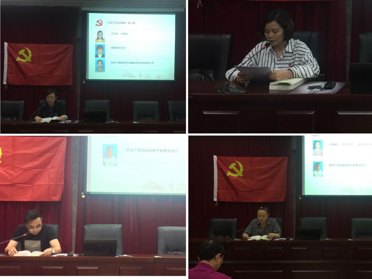 何柳英带领学习:“守纪律,讲规矩”;罗香带领学习:“增强看齐意识”;张明兵带领学习:“坚定不移推进党风廉政建设和反腐败斗争”;刘江林带领学习:“严肃党内政治生活”;伯霖带领学习:“全面落实党内监督责任”;焦荣带领学习:“牢固树立‘四个意识’,维护党中央权威”;郭斌带领学习:“用共产党员的标准严格要求自己”。