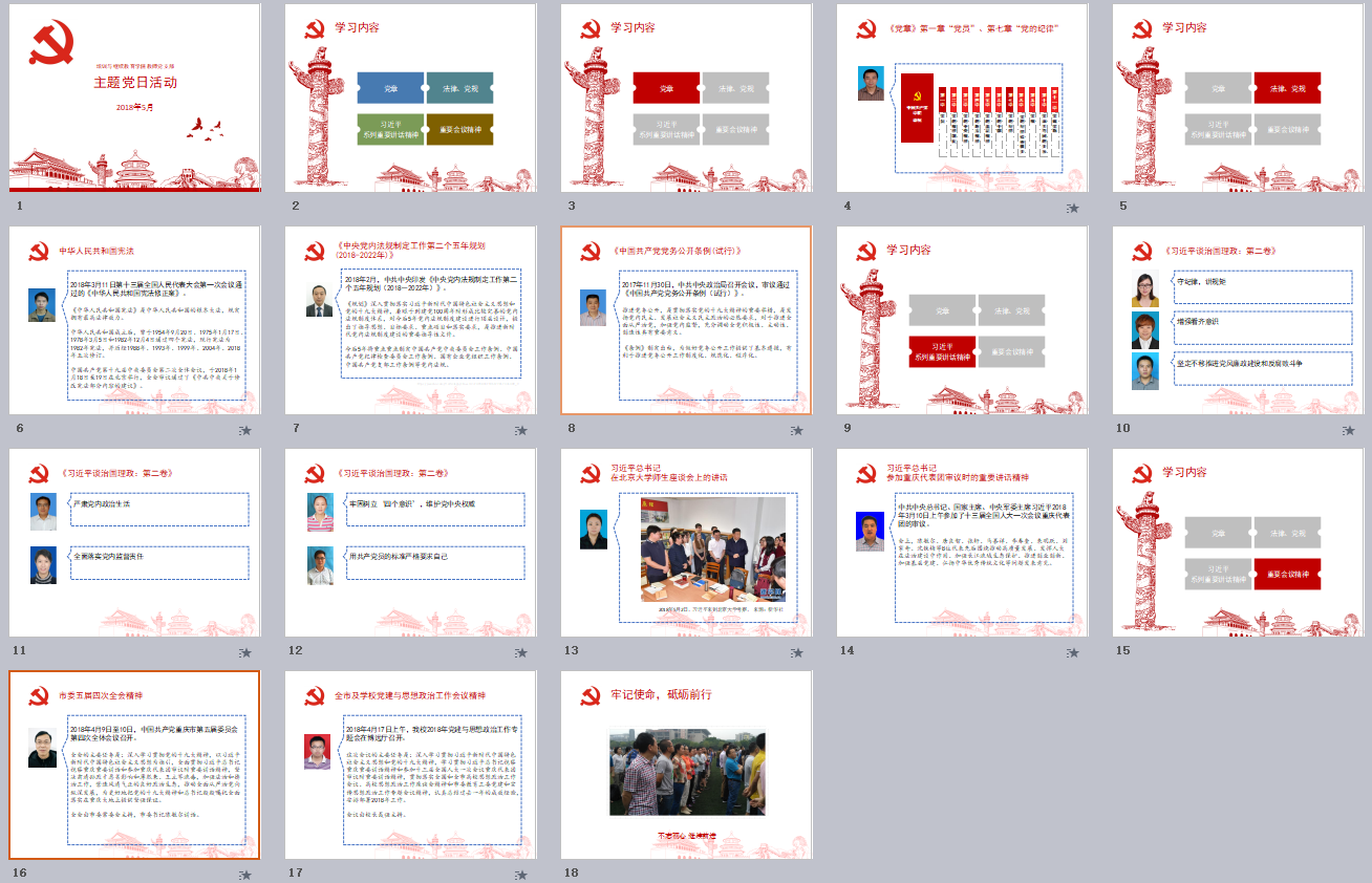 由于学生党员全部在外实习,学生支部的教师党员参加了教师支部的主题党日活动,应到党员19名,请假4名,大会由支部书记吴焱岷主持。