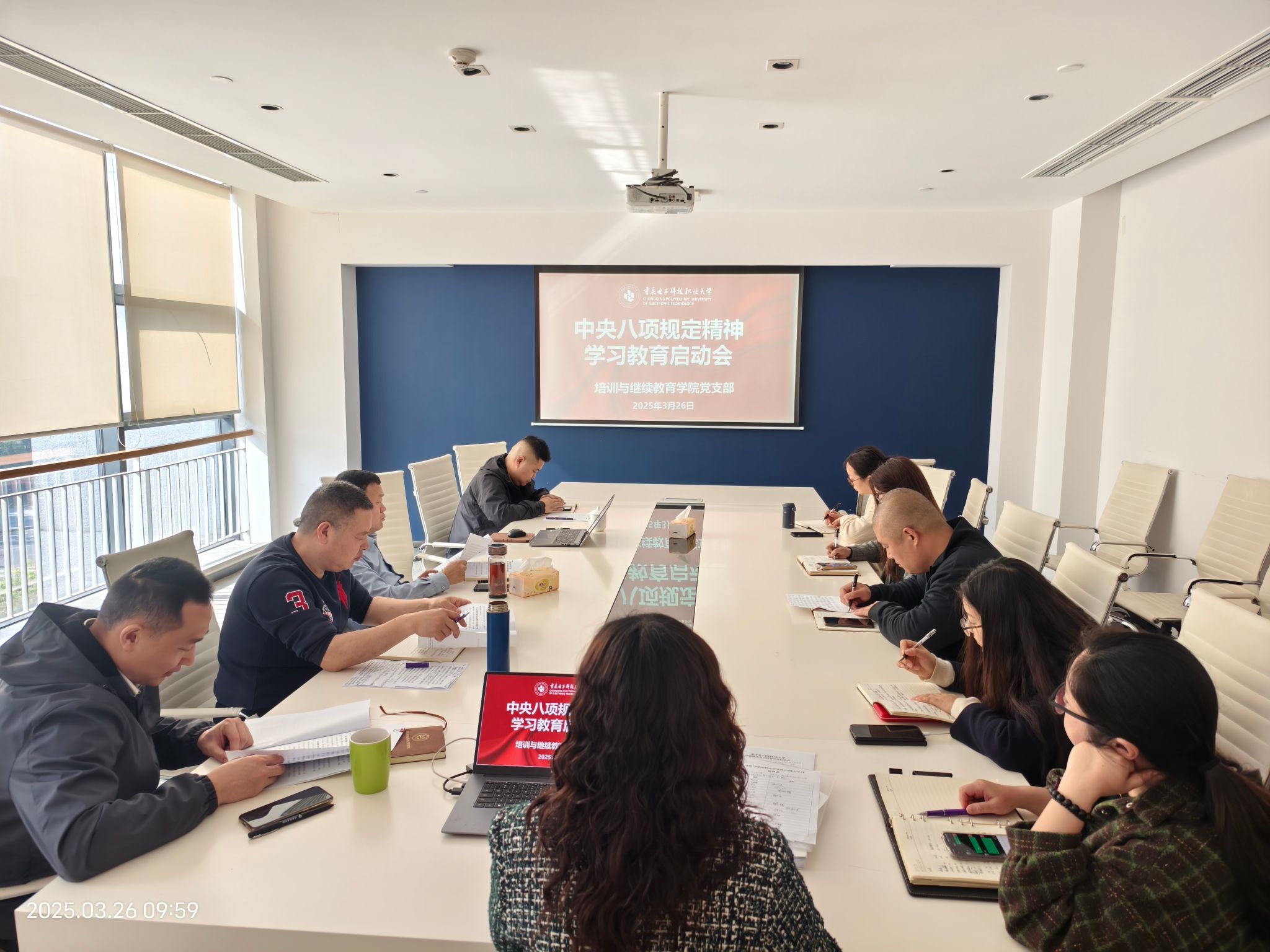 3月26日上午,在两江校区304会议室,培训与继续教育学院党支部组织召开中央八项规定精神学习教育启动部署会。会议由党支部书记莫绍强主持,副院长、九三学社社员李晓斌以及全体党员参会。
