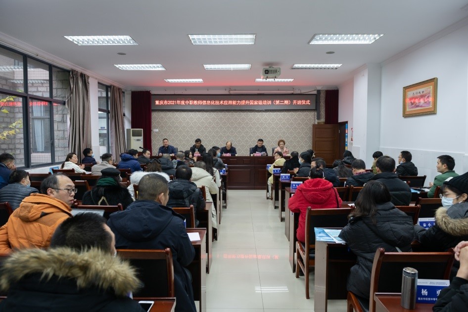 2022年1月5日上午,重庆市2021年度中职教师信息化技术应用能力提升国家级培训班(第二期)在我校南校区1-101室开班。重庆市职业教育学会驻会副会长兼秘书长况力,重庆市职业教育学会宣传培训部主任袁丽娟,重庆电子工程职业学院人工智能与大数据学院党总支书记吴焱岷,培训与继续教育中心主任、国培基地办主任莫绍强,以及来自重庆市各中职学校的50名学员参加开班仪式。