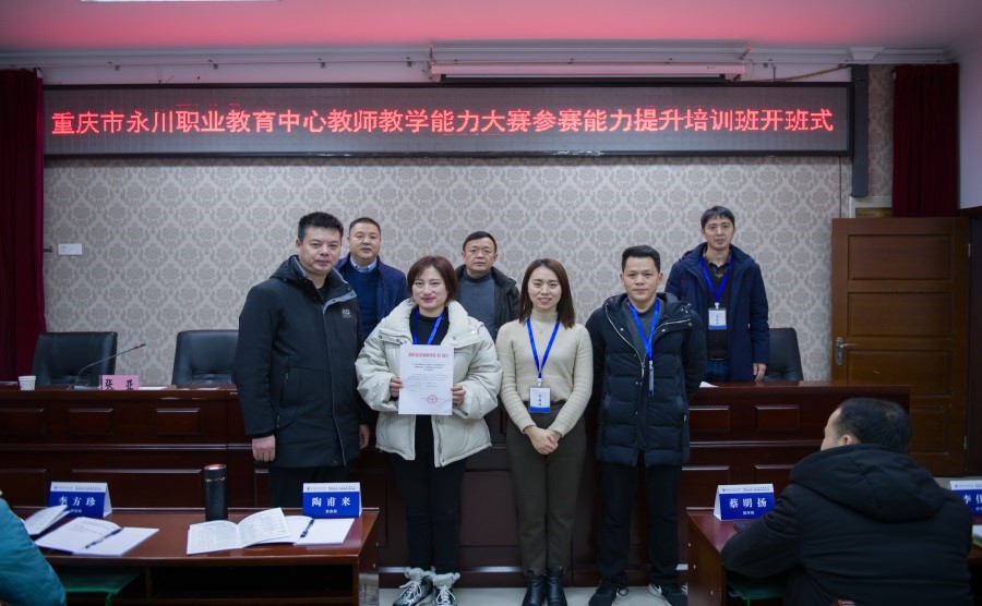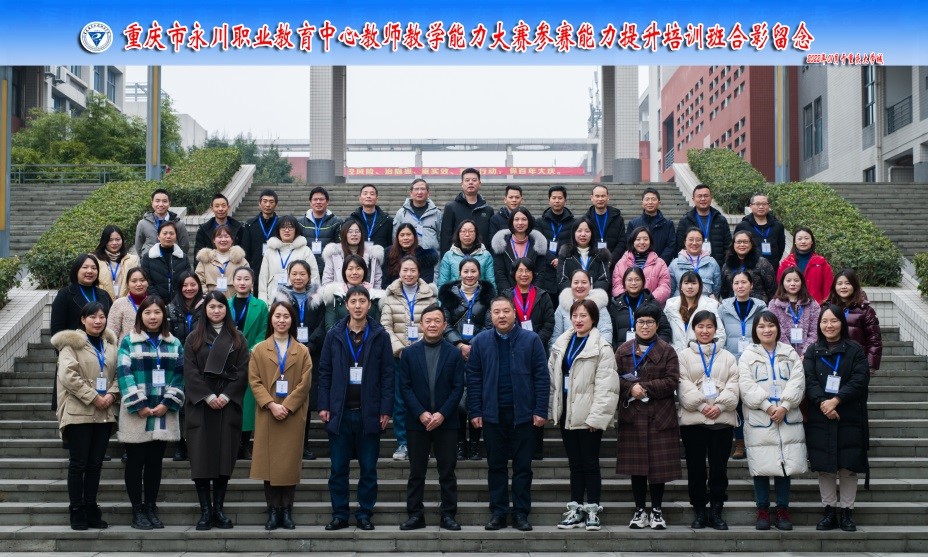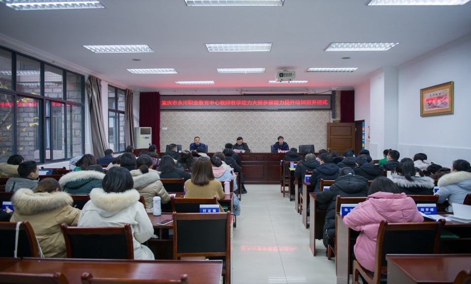 2022年1月16日上午,重庆市永川职业教育中心教师教学能力大赛参赛能力提升培训班在我校南校区1-101室举行,重庆市永川职业教育中心教务处主任张安彬,我校培训与继续教育中心主任、国培基地办公室主任莫绍强,以及来自重庆市永川职业教育中心思政组、英语组、数学组、信息技术系、现代商务系、工程艺术系和智能制造系的52名专业课教师参加开班式。