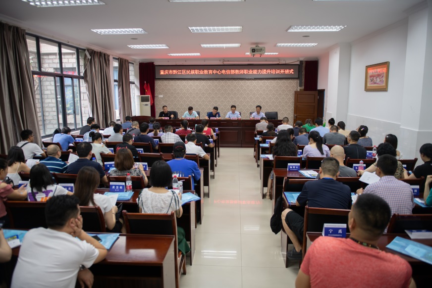 8月12日上午,重庆市黔江区民族职业教育中心电信部教师职业能力提升培训班开班式在我校国培基地1-101室举行。黔江区民族职业教育中心工会主席杨绍江、电信部主任黎红兵、党政办主任陈思,培训与继续教育中心主任陈志军、以及来自重庆市黔江区民族职业教育中心电信部的57名教师参加开班式。开班式由培训与继续教育中心继续教育科负责人张亚主持。
