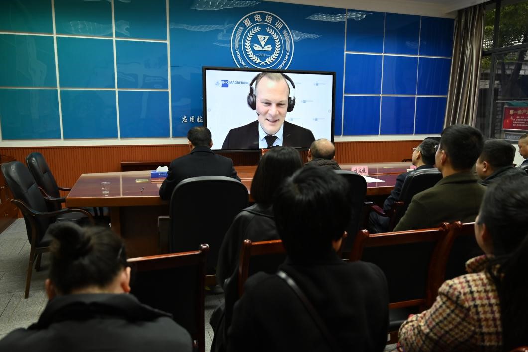 为提升职业教育对外开放水平,学习借鉴德国双元制职业教育先进经验,我校国培基地联合德国工商业协会(IHK),推出德国“IHK双元制师资认证证书”培训项目,并于2022年11月1日正式开班,培训采用在线直播课+线下课题研讨的方式,历时三周,学完全部课程内容。受疫情影响,结业考试于2023年3月2日下午在国培基地完成。随后举行了结业式。