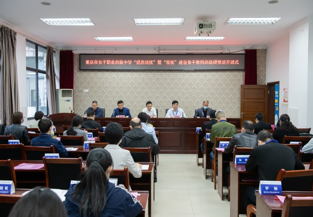 2022年4月13日,重庆市女子职业高级中学“提质培优”暨“双优”建设骨干教师高级研修班在南校区1-101室举行,重庆市女子职业高级中学校长邱孝述、副校长陈岚、张小平、朱海林,我校党委副书记、校长聂强教授,数字媒体学院院长刘晓东,以及来自重庆市女子职业高级中学的35名骨干教师参加开班式。开班仪式由培训与继续教育中心主任、国培基地办公室主任莫绍强主持。