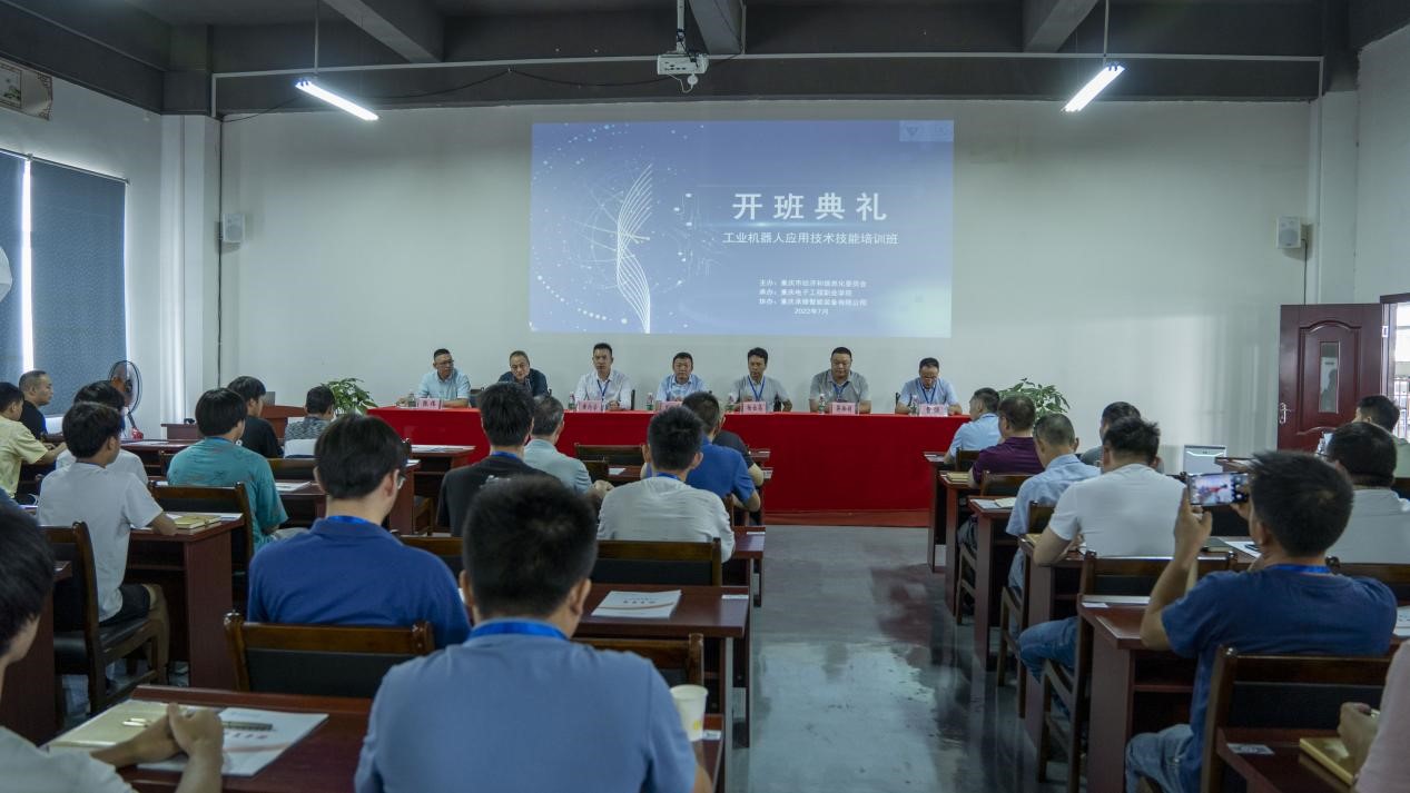 2022年7月4日由重庆市经济和信息化委员会主办,重庆电子工程职业学院承办的2022年“工业机器人应用技术技能培训班”在大足区正式开班。重庆电子工程职业学院培训与继续教育学院院长莫绍强、院长助理彭彬,制造与汽车学院工业机器人技术专业张伟主任、曹强老师,重庆承锋智能装备有限公司总经理黄均学等出席开班仪式。莫绍强院长介绍了学校培训相关情况,并对本次培训和管理提出要求和安排。
