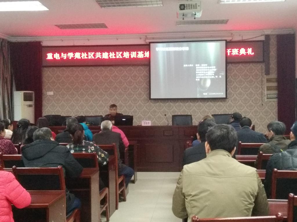 11月29日下午,重庆电子工程职业学院与陈家桥街道学苑社区共建社区教育培训基地签约仪式暨《摄影》专业培训开班典礼在培训与继续教育中心1-101培训室隆重举行。重庆电子工程职业学院科研与社会服务处处长许磊、培训与继续教育中心副主任、项目组负责人张铁力、学苑社区居委会副主任杜利华、《摄影》课程培训教师漆海帮以及38名社区学员参加仪式,仪式由张铁力主持。