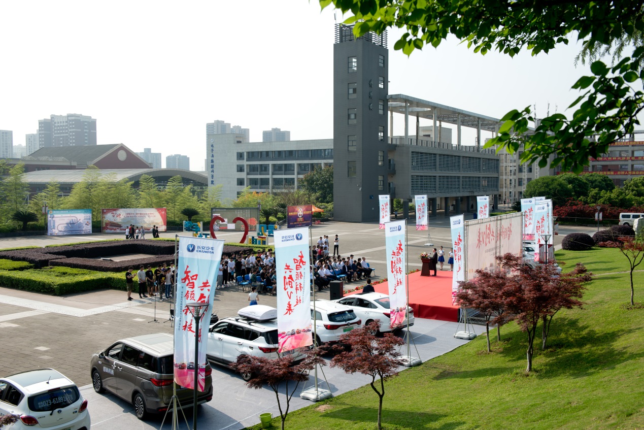 “智领科技、共创V来”!第一届长安汽车科技展进校园活动于4月22日上午在我校正式启动。长安汽车股份有限公司大客户业务部孙长松总经理、人力资源部江洋总监、大客户业务部常晓龙总监,重庆电子工程职业学院聂强校长、教务处王正勇处长、国际交流与合作处莫绍强处长、工会常务副主席唐莉、智能制造与汽车学院院长张进春、培训与继续教育中心陈志军主任等出席了活动。