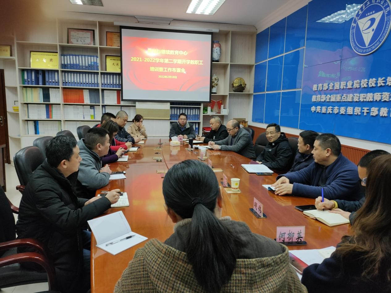 2022年1月18日上午,培训与继续教育中心(应用技术学院)在聚贤厅召开本学期教职工培训暨工作布置会,会议由李晓斌副主任主持,全体在编在岗(含长期合同人员)参会,分管校领导刘成俊副校长莅临指导。