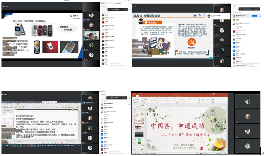 随后,各位专家教授分别从《“5G+”新时代的信息化智能产品使用》、《智能手机使用与信息安全(一)手机生活缴费》、《智能手机使用与信息安全(二)手机出行》、《防范电信网络诈骗知识》和《中国茶,申遗成功——“五个最”带你了解中国茶》等主题内容展开精彩直播讲座。各位专家深入浅出和幽默风趣的分享,受到大家一致好评。